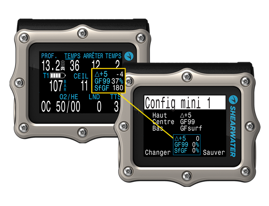 Le modèle de décompression standard est le Bühlmann ZHL-16C avec facteurs de gradient. Les modèles de décompression VPM-B et DCIEM sont également disponibles via l'achat d'un code de déverrouillage. Vous trouverez plus d'informations dans le manuel du Perdix 2. Pour en apprendre plus, nous vous invitons à lire « Clearing Up The Confusion About Deep Stops » (Clarifier la confusion au sujet des « paliers profonds ») d'Eric C. Baker, P.E.