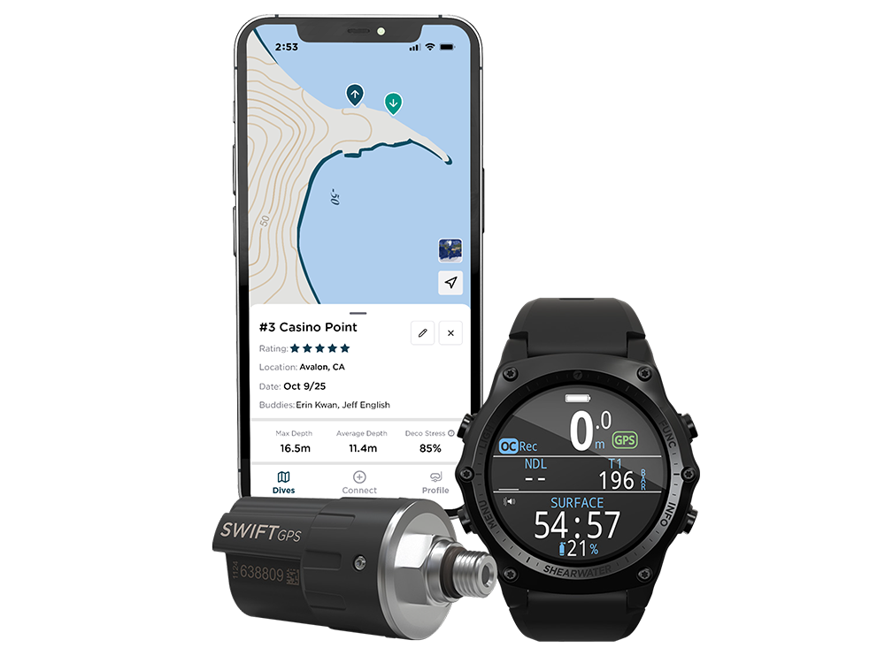 新しい Swift GPS トランスミッターで、ダイブサイトの座標を自動的に記録。エアインテグレーション対応の Shearwater コンピュータで、潜降開始地点と浮上地点を取得しましょう。