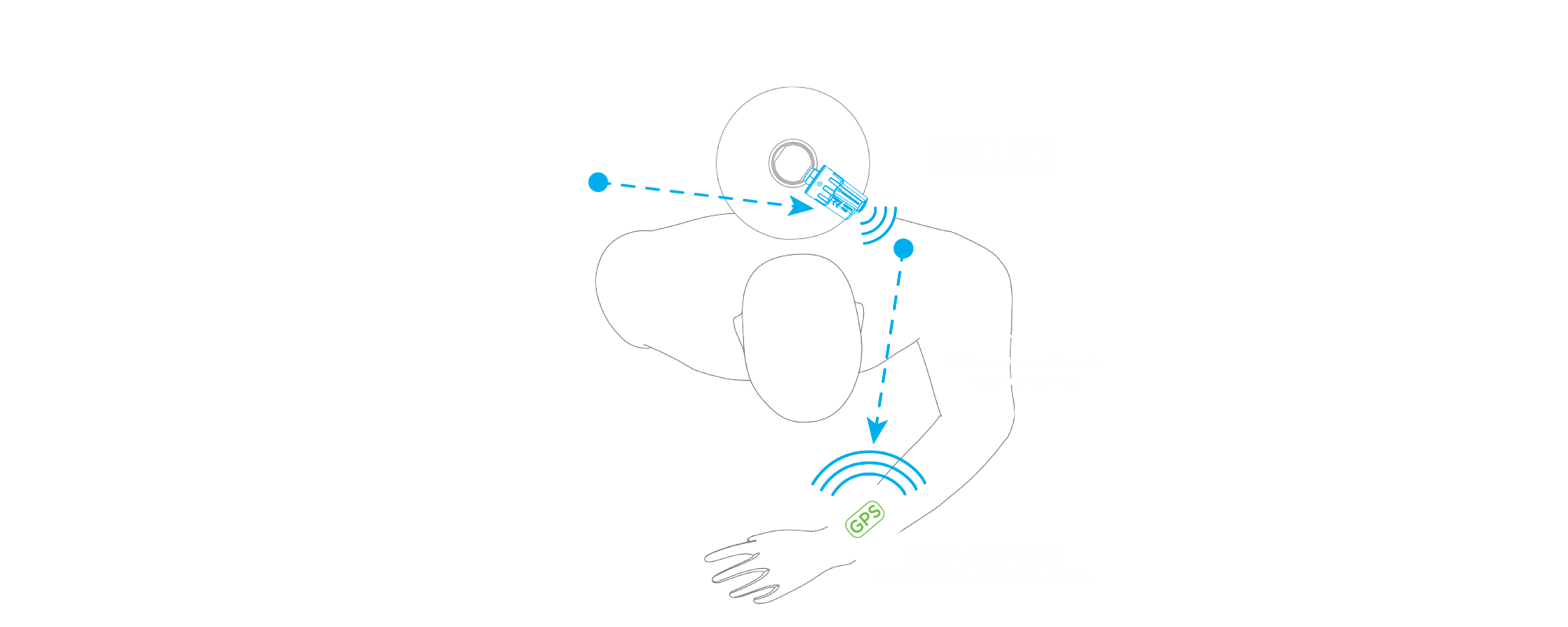 Swift GPS ใช้เครื่องรับสัญญาณระบบดาวเทียมนำทางสากล (GNSS) แบบหลายกลุ่มดาวเทียม ซึ่งจะระบุตำแหน่งจากดาวเทียม GPS, Galileo และ BeiDou ข้อมูลตำแหน่งที่ตั้งสามารถแชร์กับบัดดี้ของคุณหรือเรือที่เต็มไปด้วยนักดำน้ำได้ คอมพิวเตอร์ Shearwater ที่มีการเชื่อมต่อข้อมูลอากาศ (air-integrated) ที่อยู่ในระยะจะสามารถรับสัญญาณ Swift GPS ได้*