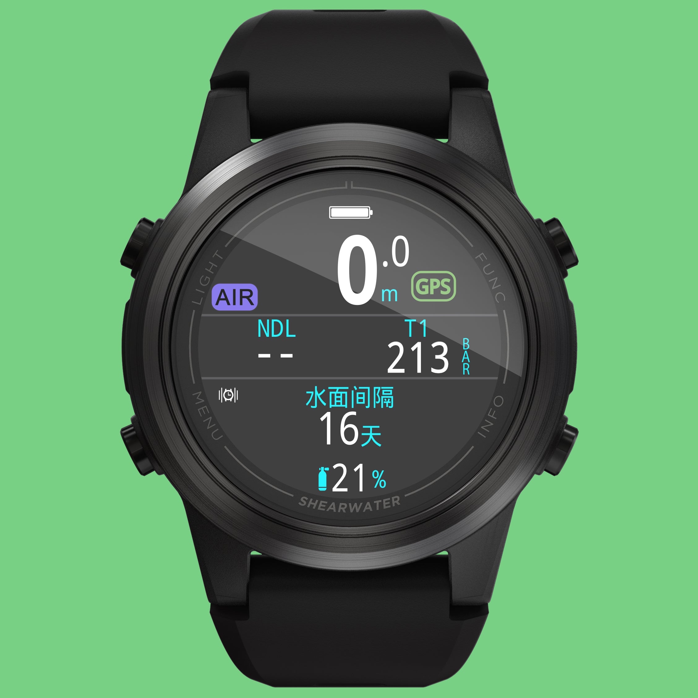 Swift GPS 的电池续航时间约为 100 个潜水小时。如果不使用,请务必确保排空安装了 Swift 的调节器内的气体。如果压力超过 3.5 bar (50 psi),Swift GPS 将继续传输气体压力数据。